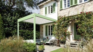 Ein Lamellendach schützt die Terrasse eines 200 Jahre alten Tuffsteinhauses bei jedem Wetter. Mit der Farbwahl verbinden sich Alt und Neu zu einem harmonischen Ensemble.