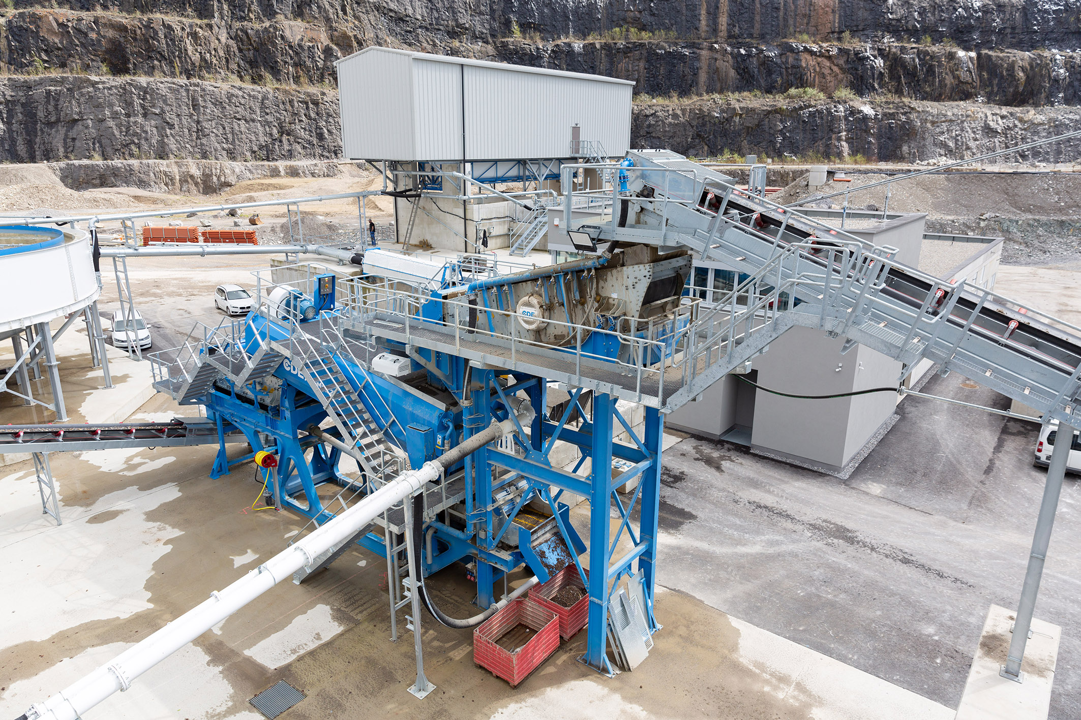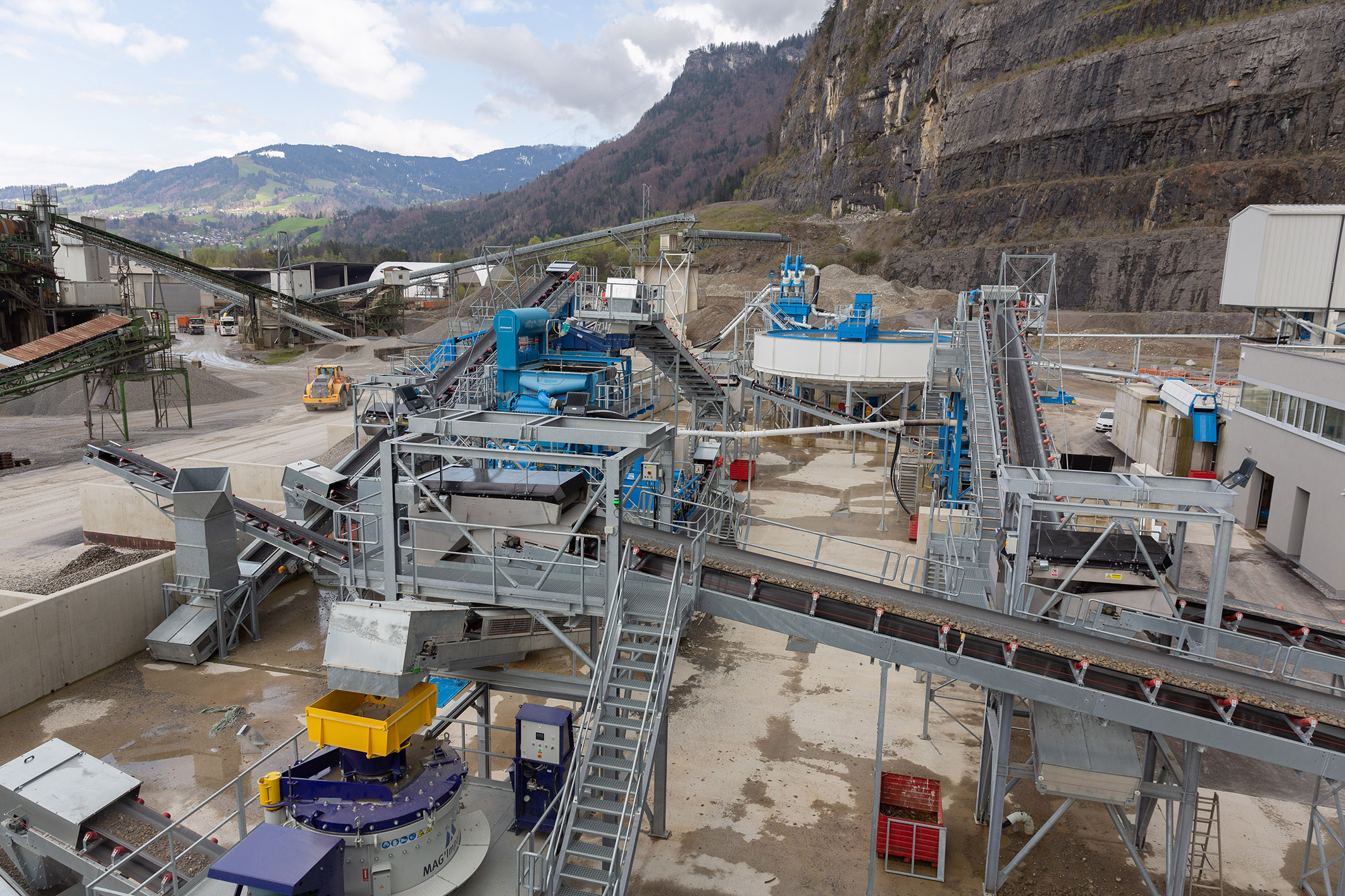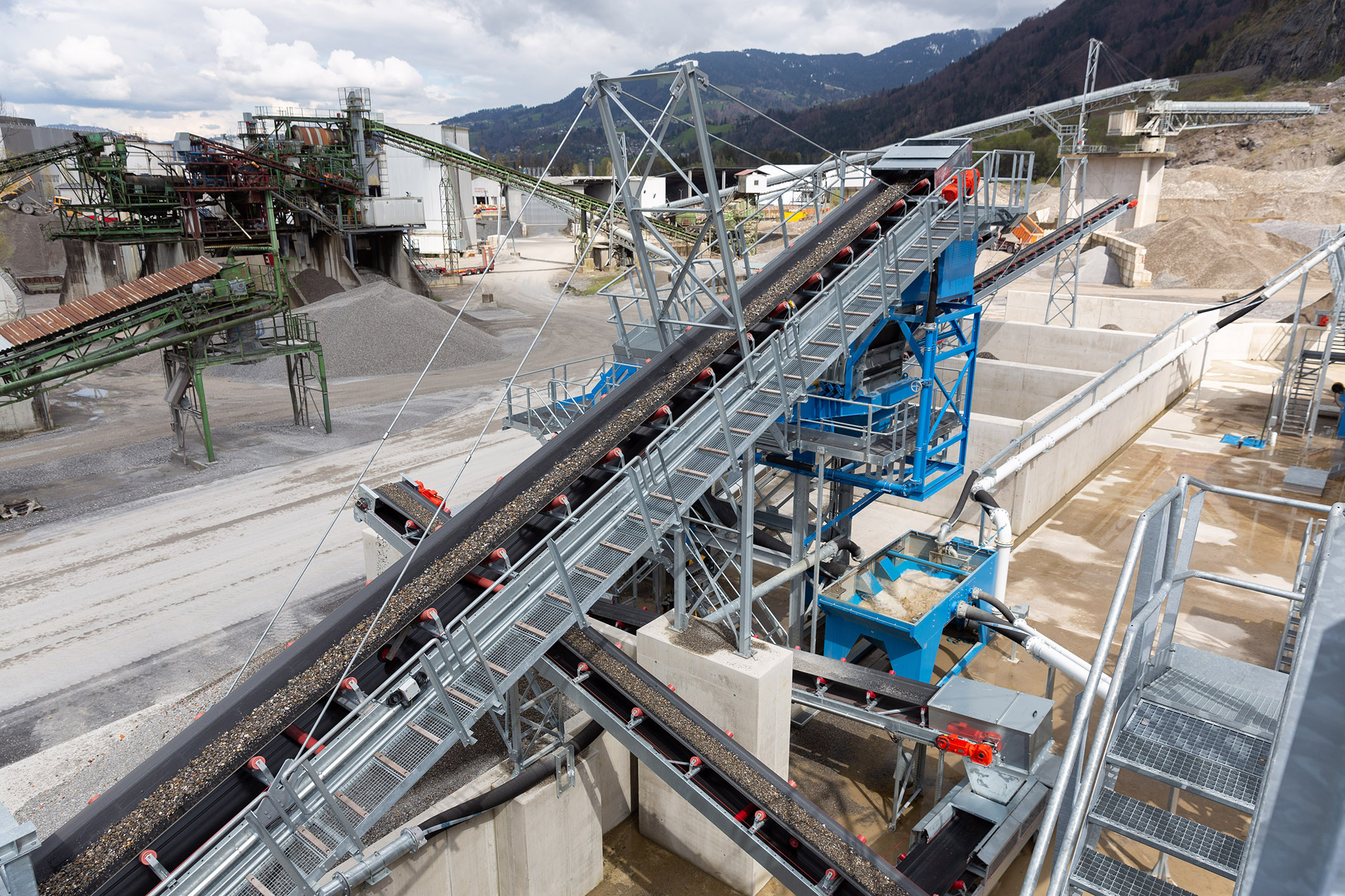 Über zwei Aufgabestellen werden die Inputmaterialien in die vermeintliche „Blackbox“ geführt, in der sie in einem anspruchsvollen Prozess getrennt, gebrochen, gewaschen und gereinigt werden. Dabei entstehen Produkte wie Sande, Körnungen, Tragschichtmaterial, Splitte oder Zuschlagstoffe für Recyclingbaustoffe. Radlader befüllen den Aufgabebunker, von wo aus das Material über Förderbänder vorgesiebt zum Brecher in die Nassaufbereitung oder – bei entsprechender Eignung -direkt auf eine Vorratshalde bzw. in die bestehende Aufbereitungsanlage gelangt. Nun werden die Inputmaterialien über eine Grobstücksiebanlage geführt. Das im Prozess verbleibende Material wird gewaschen und in der Setzmaschine weiter veredelt. Hier werden die leichten Partikel im Setzverfahren von den Körnungen getrennt und Störstoffe abgeschieden. Sand, Schluff und Wasser kommen in einen Sammelsumpf, die Sandaufbereitung erfolgt per Fliehkraftabscheidung. Doch auch an die Wasseraufbereitung ist gedacht, das Überlaufwasser bzw. die verbleibenden Feinanteile und Schluffe werden über einen Rundeindicker voneinander getrennt. Das so gereinigte Brauchwasser gelangt wieder in den Prozesswasserspeicher und kann erneut verwendet werden. Die verbleibenden Schlämme werden getrennt gesammelt und gepresst.
