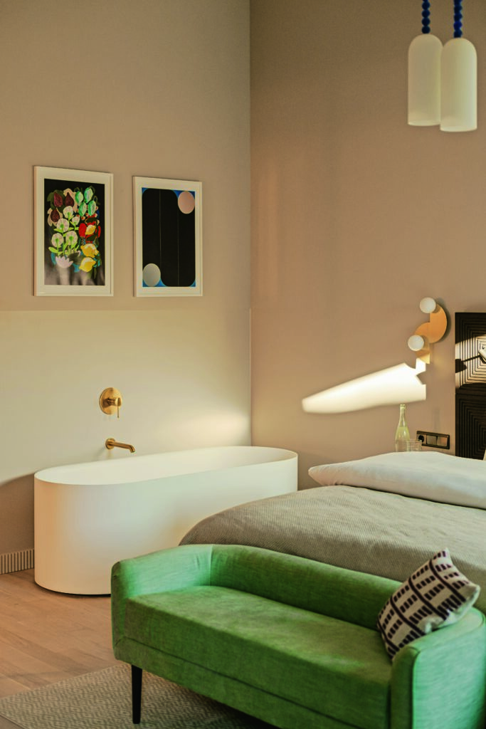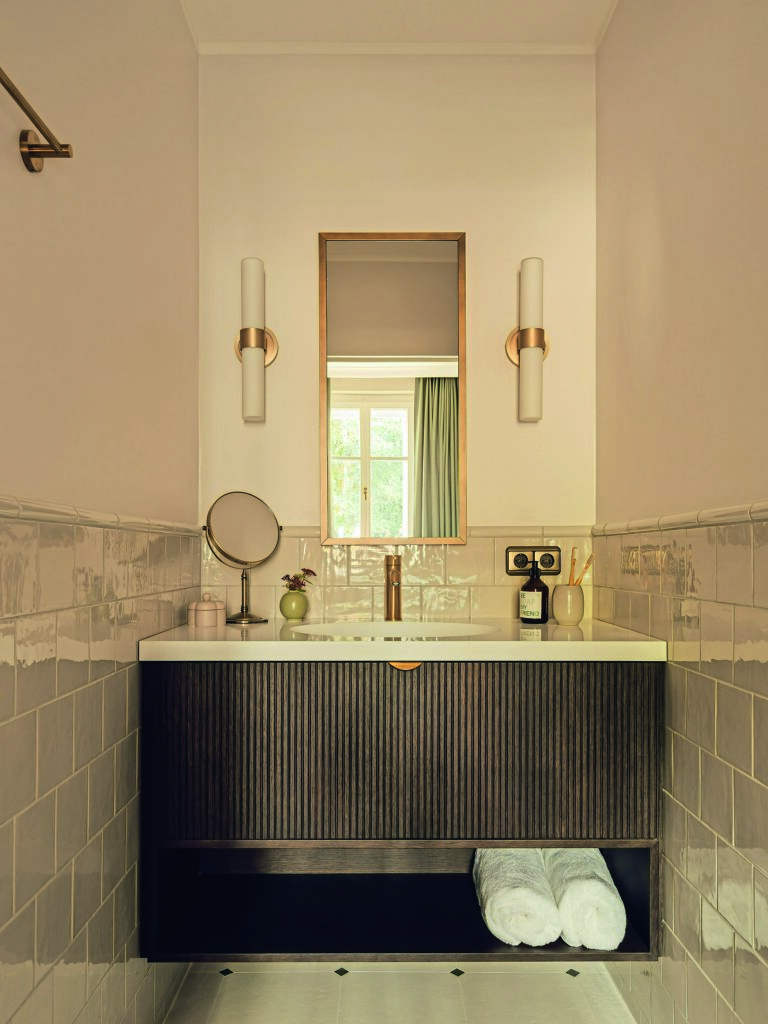 Armaturen aus der Serie Grohe Essence Linie in Cool Sunrise gebürstet fügen sich harmonisch in das Designkonzept des Hotels ein. ©Pion Studio