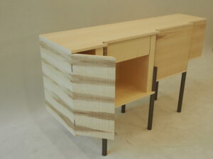 Auffällig ist die waagrechte Maserung des in zwei Richtungen abgestuften Sideboards, dessen Korpus in Kernahorn furniert ist: nach hinten durch drei Hohlkehlen, welche gleichzeitig als Griffmulden und Halterung der runden Füße dienen, und von unten nach oben durch Abstufungen. Zu öffnen ist das Möbel mittels dreier Rollläden und einer Tür. Die Rollläden verlaufen waagrecht nach hinten und werden durch Mittelseiten verdeckt. Im mit Ahorn furnierten Innenraum befinden sich zwei Schubladen, welche an der Unterkante zu öffnen sind sowie ein Fach. „Eine Besonderheit ist mit Sicherheit der versteckte Griff bei dem rechten Rollladen. Dieser ist fast unsichtbar und wird mit Druck betätigt. Nimmt man den Druck wieder weg, kehrt der Griff wieder in seine Anfangsposition zurück“, erklärt Scherfler.