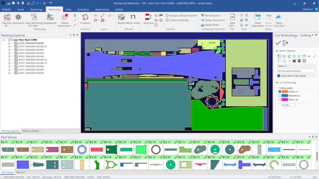 Die Verschachtelung kann die Ausnutzung der Bleche maximieren. Geschickte Anordnung auf dem Platten-oder Rohrmaterial positioniert Werkstücke möglichst dicht nebeneinander – und so viele wie möglich. Das leisten die Spezialprogramme von Lantek für die automatisierte Maschinenprogrammierung: Lantek Expert für Blechschneidmaschinen und Lantek Flex 3D für Rohr-und Profilschneidmaschinen. Beide Software-Tools sind maschinen-und herstellerunabhängig. Wenn auch das primäre Ziel ist, Material optimal zu nutzen, sodass nur noch kleine Schrottstücke übrigbleiben, kann die Software von Lantek auch die Reste von wiederverwendbarem Material erfassen und für die spätere Nutzung auf allen Schneidmaschinen in der Werkstatt verwalten. Mit den Software-Tools von Lantek können Anwender*innen laut eigenen Angaben jährliche Einsparungen im Restblechbestand von bis zu 70 Prozent und beim Rohstoffverbrauch von mehr als 8 Prozent erzielen.