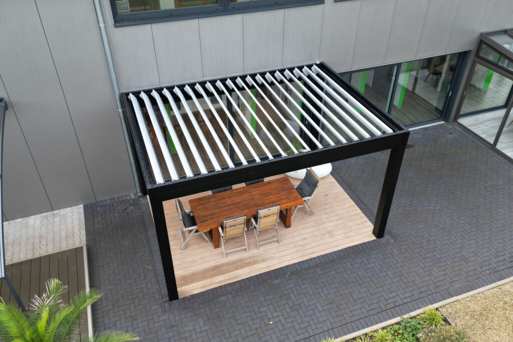 Mit einer Tragfähigkeit von bis zu 350 Kilogramm pro Quadratmeter ist das Lamellendach sehr hoch belastbar und bietet selbst in schneereichen Gebieten hohe Sicherheit. Aufgrund dieser Statik ist es nicht nur als Beschattung, sondern auch als Dach nutzbar. Die bis 135 Grad drehbaren Lamellen regulieren Licht, Schatten und natürliche Belüftung – steuerbar entweder per App oder Fernbedienung.