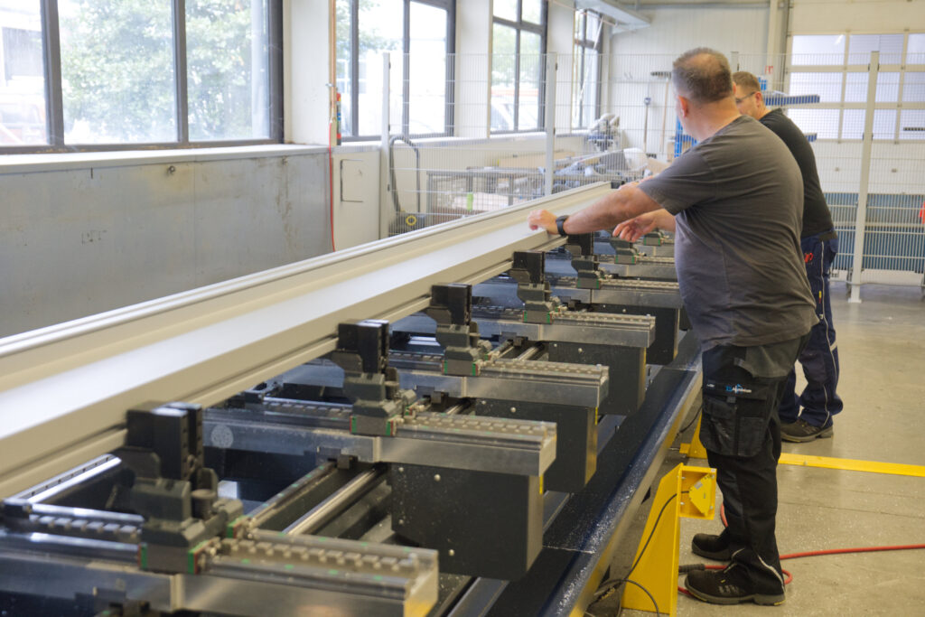 Ein Stabbearbeitungszentrum schneidet die Bauteile nach den Projektvorgaben zu und bohrt präzise die Löcher vor. Auch Gehrungsschnitte sind kein Problem. Der Metallbaubetrieb bekommt montagefertige Bauteile. Copyright: TS-Aluminium-Profilsysteme