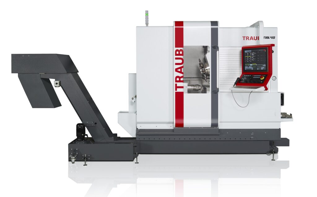 Die Traub TNK40 ist konzipiert für das hochproduktive Kurzdrehen von Werkstücken mittlerer und hoher Komplexität. Statt des verfahrbaren Spindelstocks fürs Langdrehen besitzt die TNK40 einen festen Spindelstock mit 40 Millimeter Durchlass. Durch die vibrationsarme Stangenzuführung erreicht die Maschine insgesamt eine bessere Steifigkeit als die Langdrehausführung, was die Bauteilqualität steigert. In Inneren arbeiten zwei baugleiche Arbeitsspindeln mit bis zu 8.000 Umdrehungen pro Minute. Das Maschinenbett ist robust, eine zeitgleiche Bearbeitung mit zwei, drei oder vier Werkzeugen ist daher möglich.