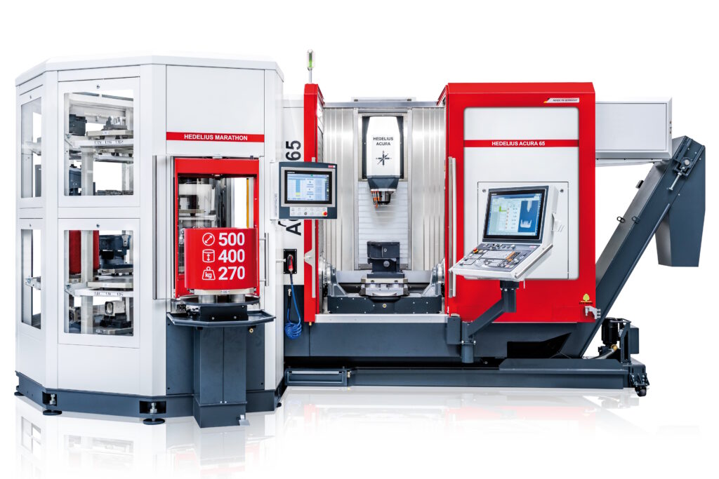 © Hedelius: Das 5-Achs-Bearbeitungszentrum Acura 65 mit der Palettenautomation Marathon SR422 ist eine ideale Kombinationfür die automatisierte Kleinserienfertigung.