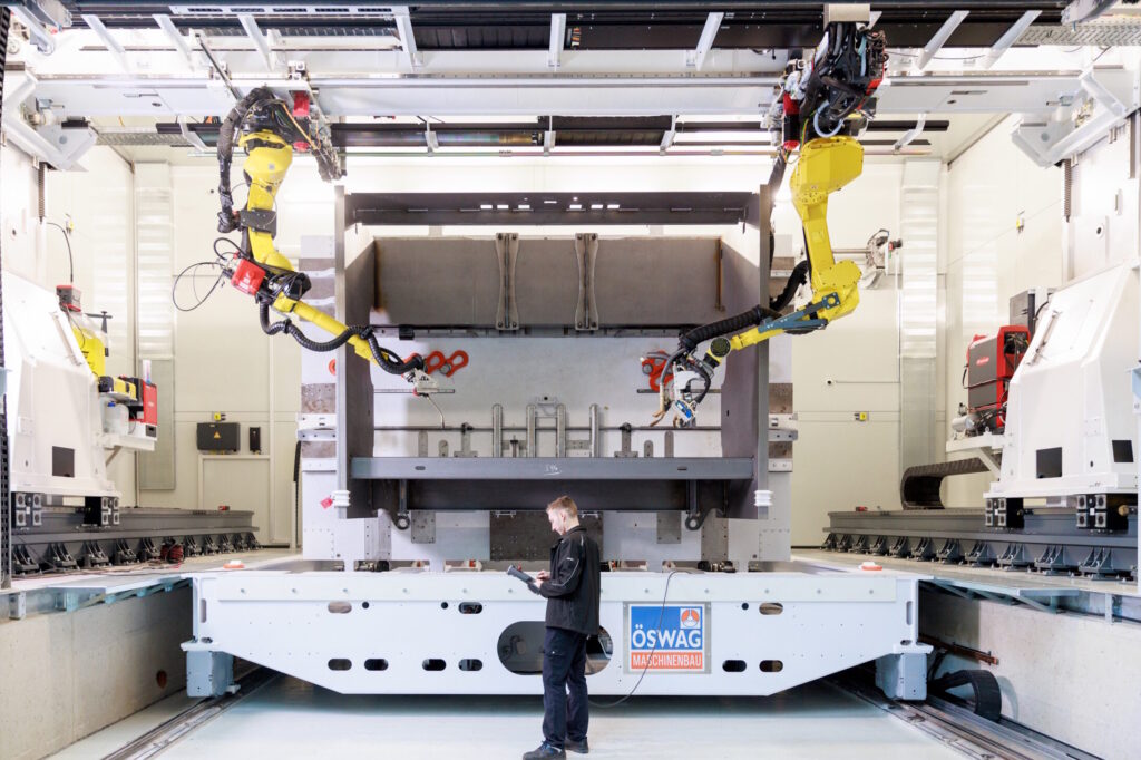 Trumpf verzeichnete in den letzten Jahren ein signifikantes Wachstum bei Biegemaschinen und erweiterte das Produktportfolio kontinuierlich. Die gestiegene Kapazitätsauslastung machte den Zukauf tonnenschwerer Rahmen für Biegemaschinen notwendig, was zu verlängerten Herstellungszeiten, höheren Kosten und eingeschränkter Flexibilität in der Fertigung führte. Geschweißt wurde beim Lieferanten manuell, verbunden mit aufwendiger Nacharbeit: Um im Anschluss an das Handschweißen unerwünschte Aufhärtungen im Stahl zu vermeiden, war ein energieintensiver Weichglühprozess notwendig.