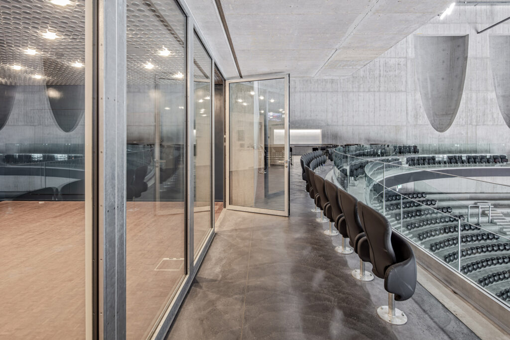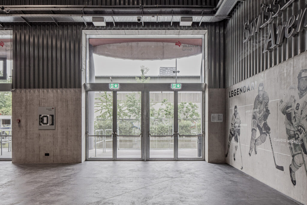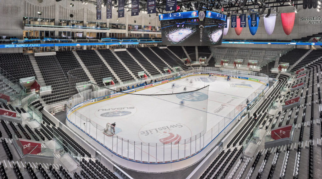Auf eine Länge von 170 Metern erstreckt sich die neue Swiss Life Arena in Zürich zwischen einer Autobahn und Bahngleisen. Der Koloss aus Stahlbeton misst in der Breite weitere 110 Meter und erhebt sich im mittleren Bereich bis zu 33 Meter über der Grundfläche. Um 90 Grad zur Längsseite gedreht, fügt sich die Arena in das Volumen ein. Einem Hexenkessel gleich bietet sich dort bis zu 12.000 Zuschauer*innen Platz. Die prestigeträchtige Eishockey- und Sporthalle mit ihrer 30 Meter hohen, steilen Tribüne wird von Gastronomie und einem VIP-Bereich, einem Business Center mit Konferenz- und Seminarräumen sowie weiteren Sport- und Trainingsbereichen flankiert. Im Süden ist außerdem eine große Dachterrasse als weitläufige Ankunftszone mit Aufenthaltsmöglichkeit in die Struktur eingeschnitten.