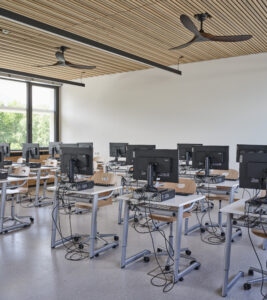 Die Luft strömt in das zentrale Treppenhaus aus den Klassenräumen über und wird dort abgesaugt. Im Hochsommer gibt es Deckenventilatoren. Mit dieser Ergänzung kann man aus den 28-29 Grad, die ohne Klimaanlage auch mal bei zwei heißen Sommerwochen am Stück entstehen, gefühlt 26, 27 Grad machen. Das Komfortempfinden verbessert sich durch Luftbewegung deutlich.