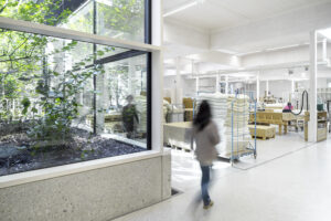 Ein denkmalgeschütztes Gebäude ist herausfordernd, trotzdem hat man es geschafft, ein natürliches Lüftungssystem zu entwickeln, das einen Großteil des Jahres funktioniert. Vorhandene Schornsteine konnte man als Abluftschächte für das Lüftungssystem nutzen. Über die Gebäudehöhe wurde ein thermischer Auftrieb erzeugt, der die natürliche Lüftung unterstützt. Ein integrierter Wintergarten funktioniert rein passiv, ohne aktive Klimaanlage. Er stellt eine Art Pufferzone dar, einen Rückzugsort, einen Mid-Door-Space, der einen Innen-Außenraum-Übergang schafft und die Verbindung zur Außenwelt oder zur Natur stärkt.